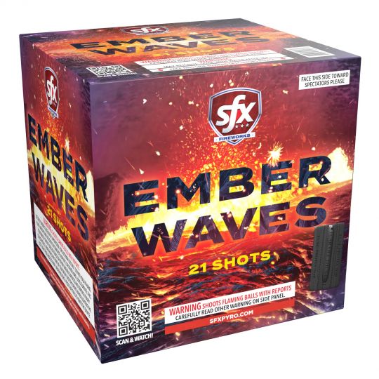 Ember Waves features a steady flow of aerial breaks with blue or pink stars to gold lace, angled "V" shots of blue stars to silver fish, and a 5-shot finale of gold palms to red lace.
